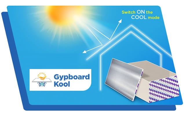 Gypboard® Kool™ is a special gypsum board with a metallic Aluminium foil on the back side. This foil provides heat/solar reflectance and protection against moisture (on foil side).